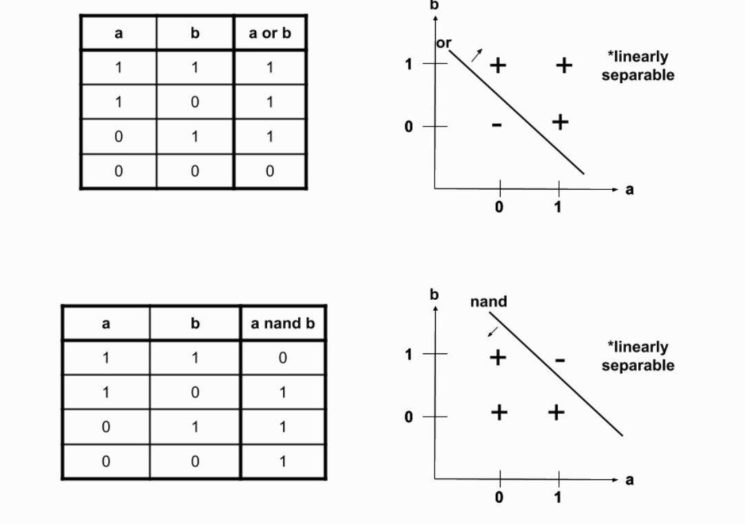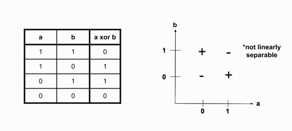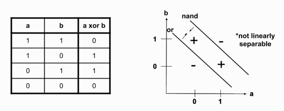 xor 연산자는 선형적이지 않다. 위 이미지를 보더라도 그렇지 않다는 것을 직관적으로 파악할 수 있다.
