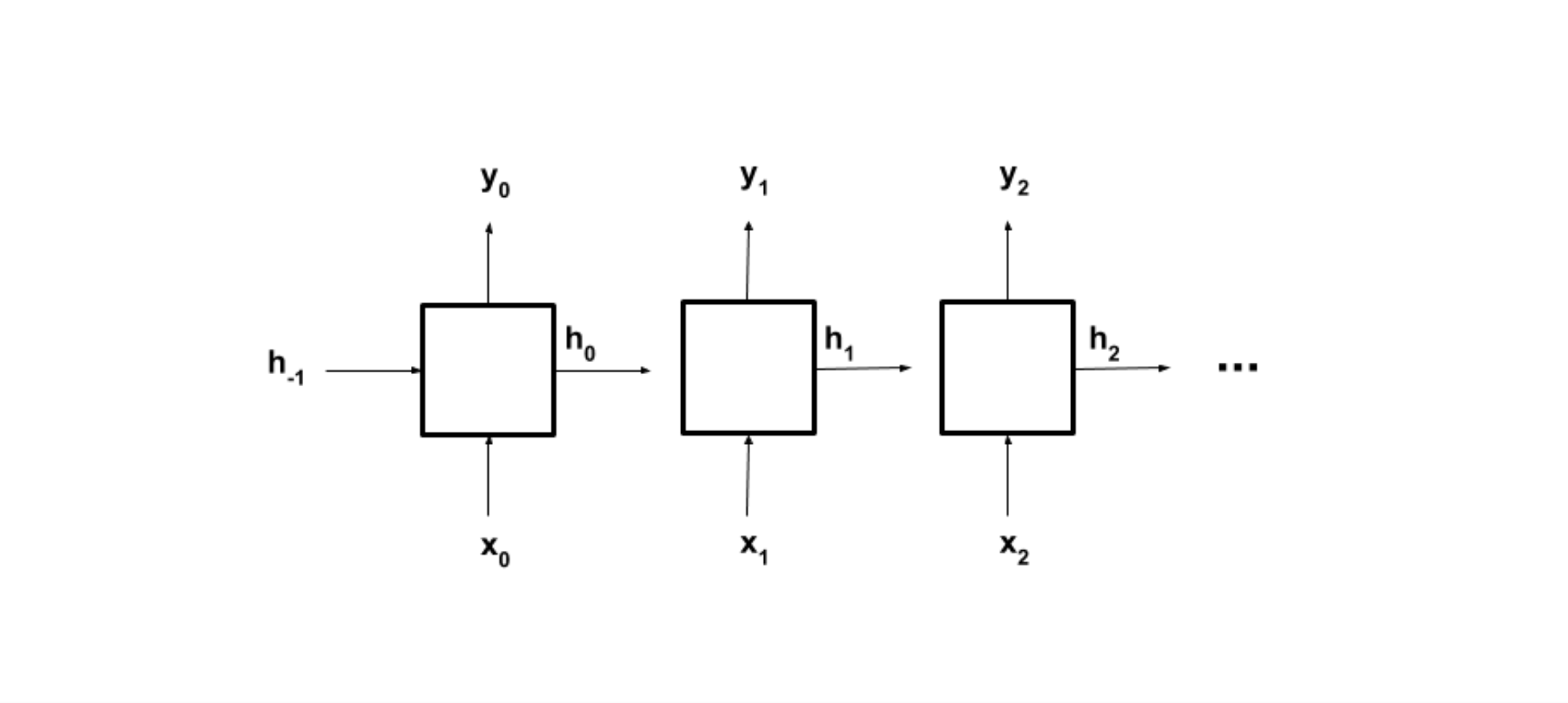 위에서 가정한 분류 문제를 가지고 RNN 구조를 설명하면, x_0에 수열의 첫 번째 원소를 넣어주고, 처음에 짝으로 시작하므로 h_-1에는 짝을 나타내는 [1, 0]을 집어넣는다. 이를 가지고 첫 단계에서는 첫 원소까지의 홀짝 여부를 산출하고 y_0과 h_0에 해당되는 값을 넣어준다. 이어 h_0와 두 번재 원소를 지칭하는 x_1을 두 번째 단계에 입력을 받고 그에 맞는 출력 값과 hidden state를 산출하는