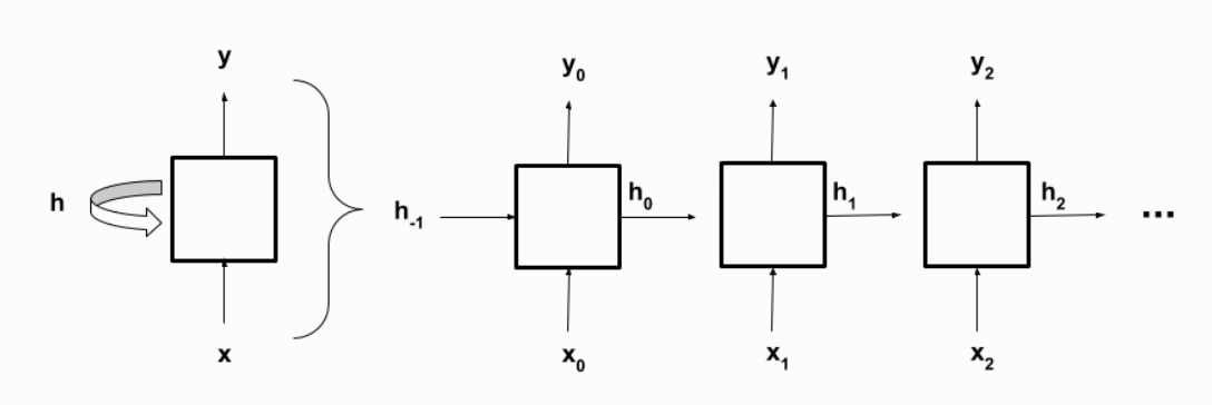 x_t는 입력, y_t는 출력, h_t는 hidden state를 의미한다. 입력으로 수열의 첫 번째 원소부터 마지막 원소까지 차례로 넣게 된다. 각 스텝마다 입력 값, 이전 스템의 hidden state를 받아서 새로운 hidden state와 출력 값을 산출하게 된다.