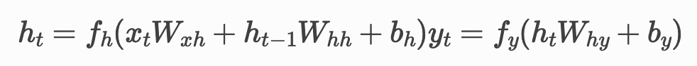· hidden state인 h_t는 입력 값 x_t와 이전 hidden state인 h_t-1을 결합하고 활성화 함수 f_h를 적용한 값이다.